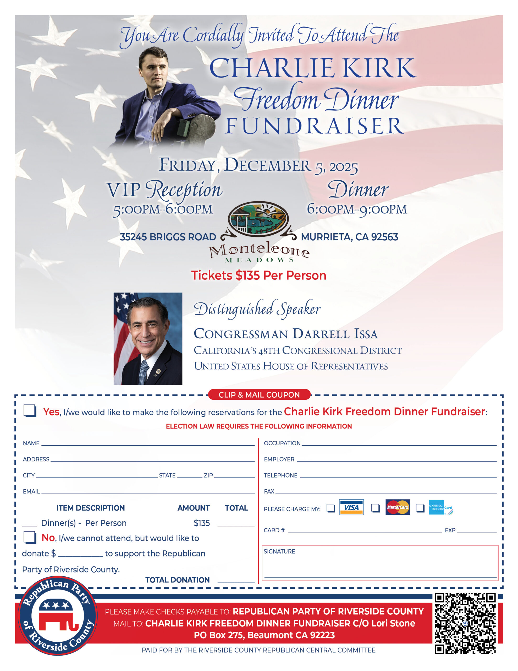 You are cordially invited to attend our Charlie Kirk Freedom Dinner Fundraiser.